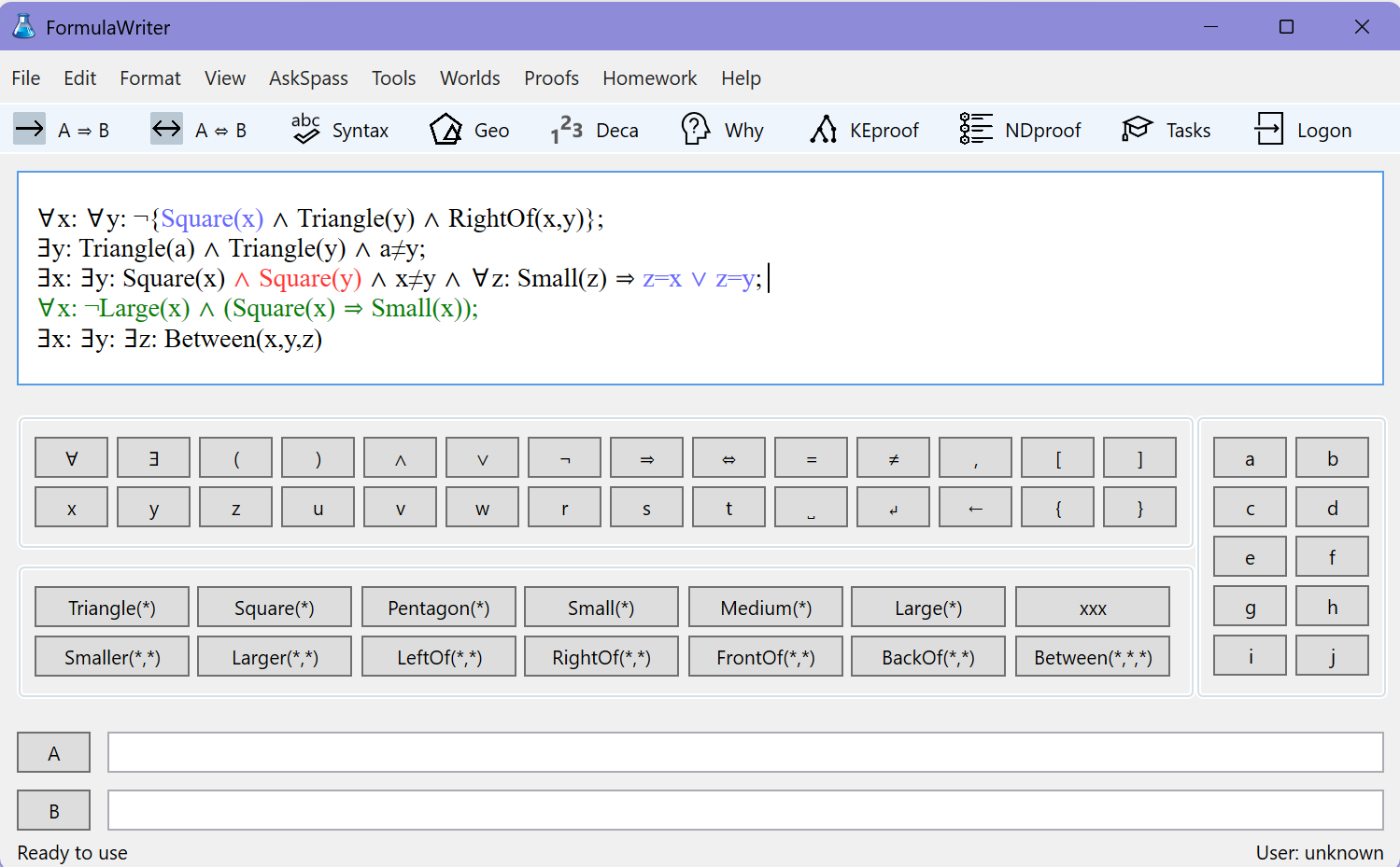 Window FormulaWriter enables you to write logical formulas very fast by clicking on buttons, and to find any syntax errors.