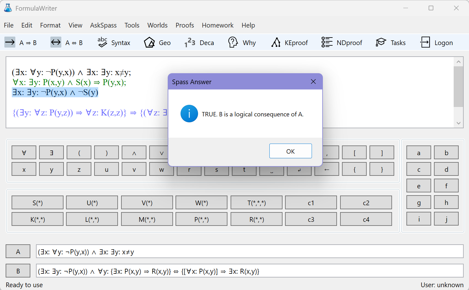 Use menu item 'AskSpass' of Window FormulaWriter to ask whether two formulas are logically equivalent, or whether a formula is a logical consequence of given hypotheses.