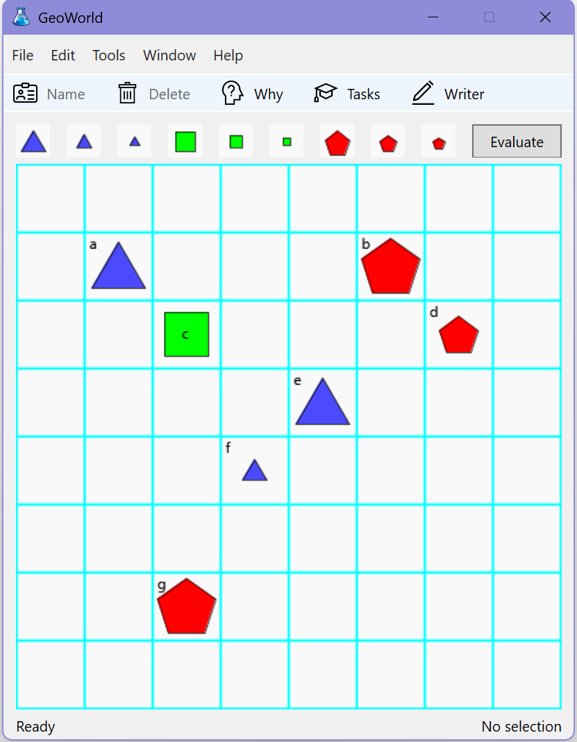 Window GeoWorld enables you to graphically construct a GeoWorld which consists of figures on a chessboard. The figures can be triangles, squares or pentagons, and can be Large, Small or Medium.
