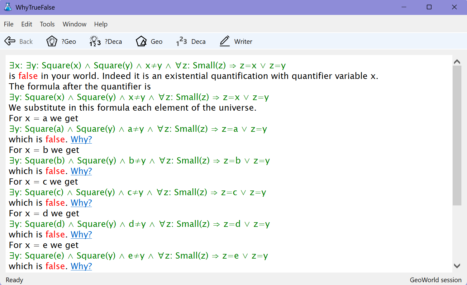 Window WhyTrueFalse enables students to obtain an explanation of why a logical formula is true (or false) in the connstructed GeoWorld or DecaWorld.