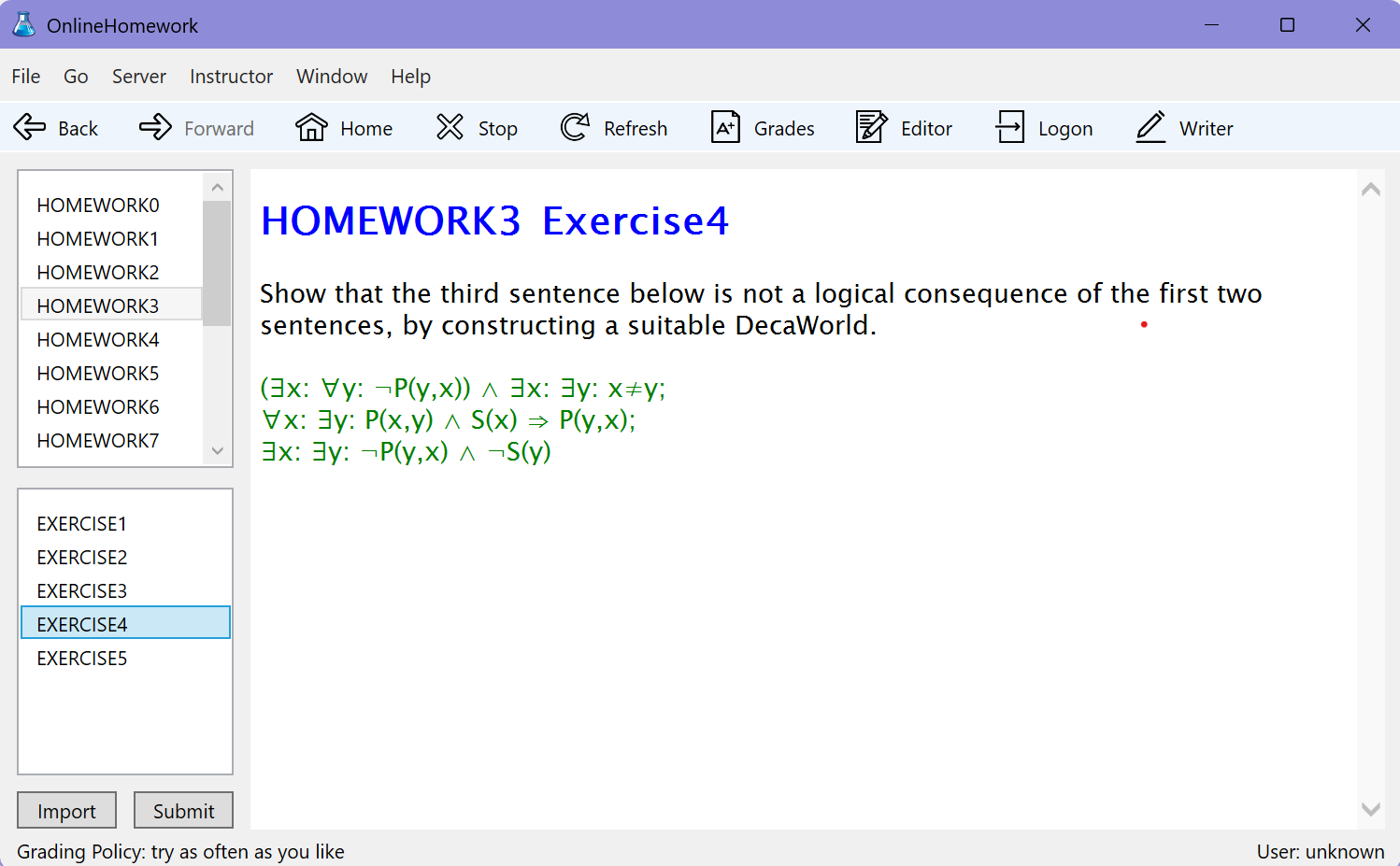 The homework exercises are displayed in window OnlineHomework. For exercises on translations or prenex normal form, the solution is a formula that must be written and selected in window FormulaWriter. Exercises that ask to make a GeoWorld or DecaWorld must be be done by constructing a suitable world in window GeoWorld or DecaWorld.