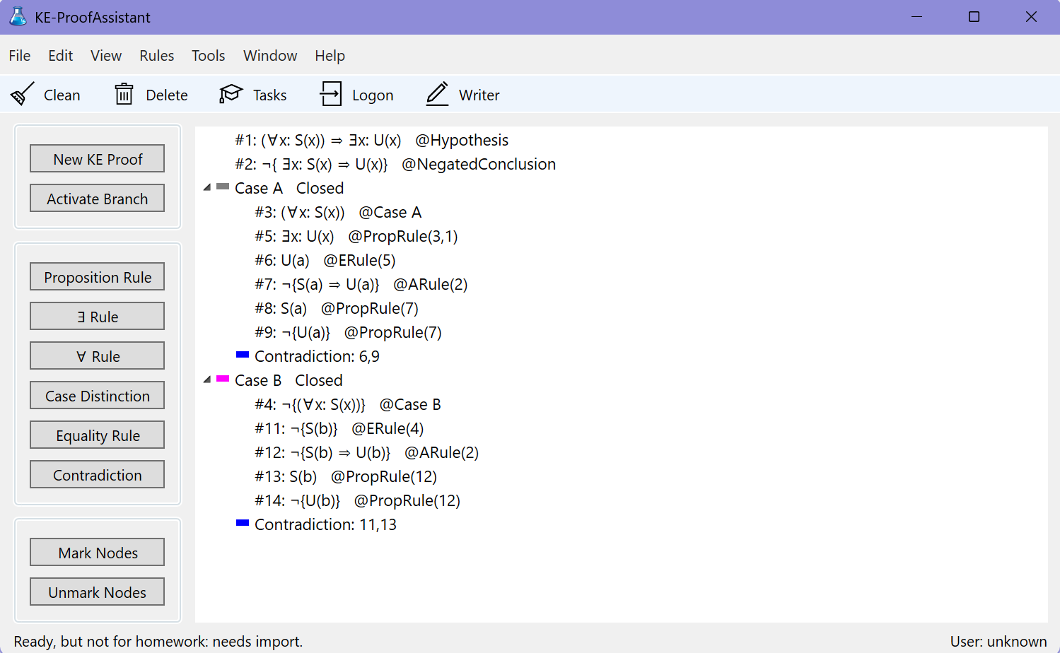 Window KE-ProofAssistant enables students to construct correct formal proofs (in the context of predicate logic) based on Kleene Elimination. KE-proofs start by assuming the negation of what has to be proved. So it suffices to derive a contradiction. Case distinctions are allowed, and