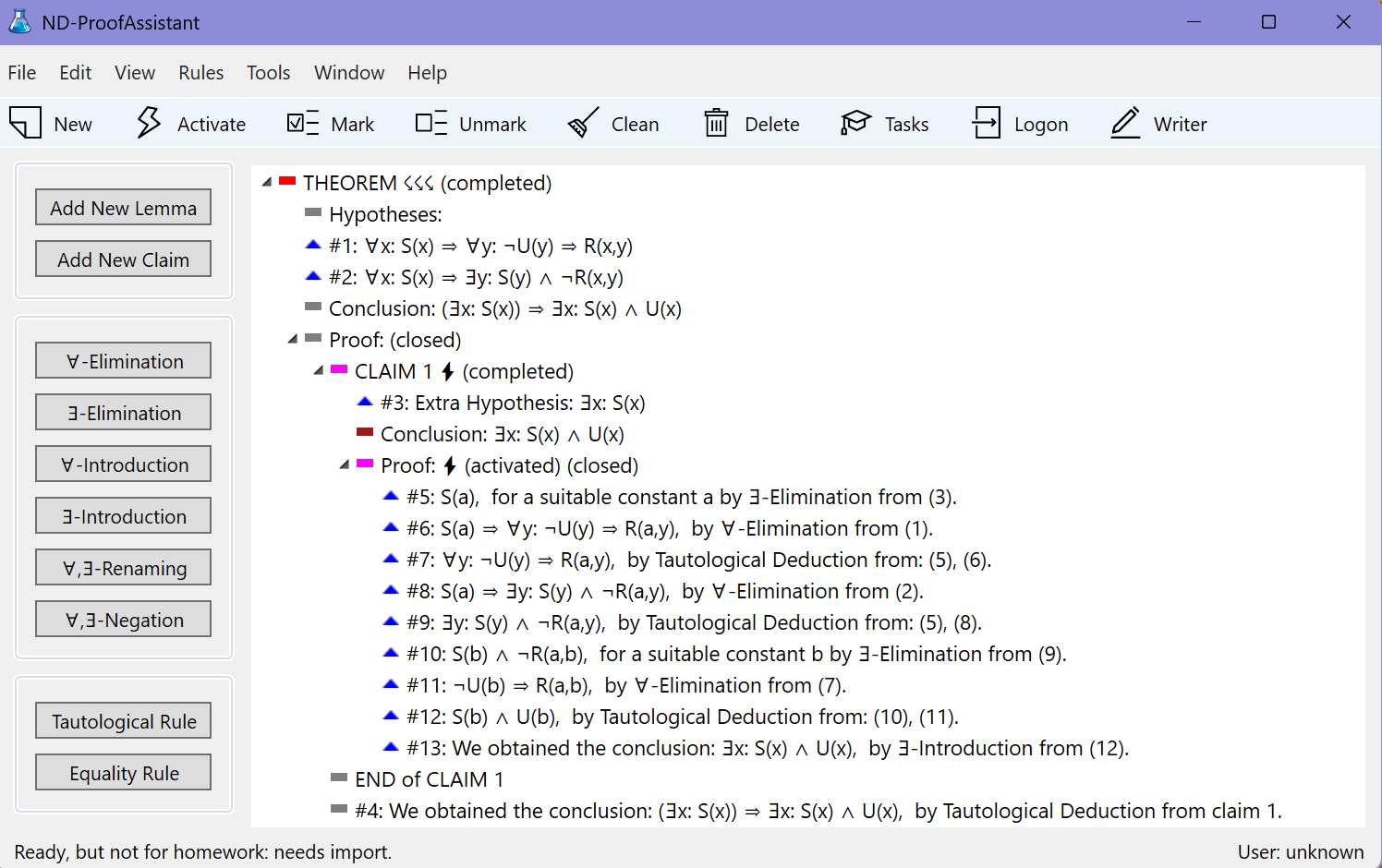 Window ND-ProofAssistant enables students to construct correct formal proofs of theorems (in the context of predicate logic) based on a new variant of Natural Deduction.